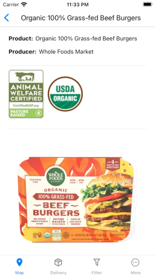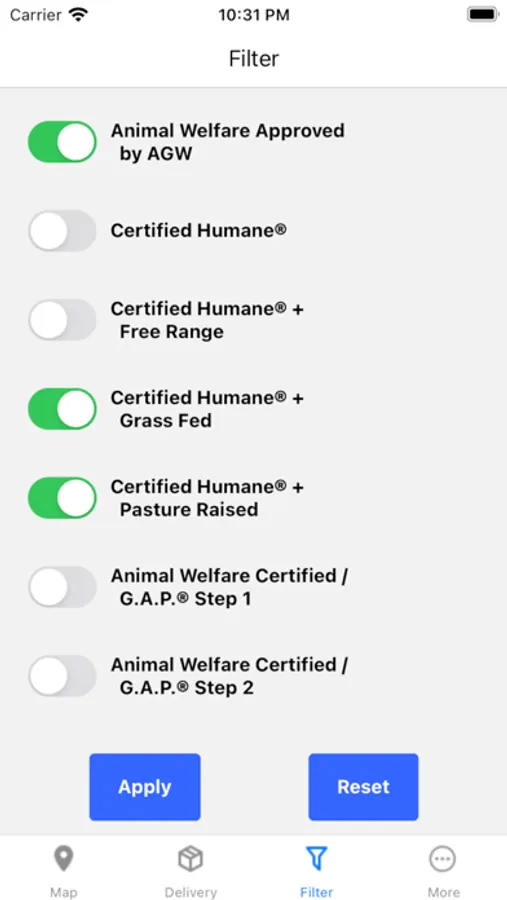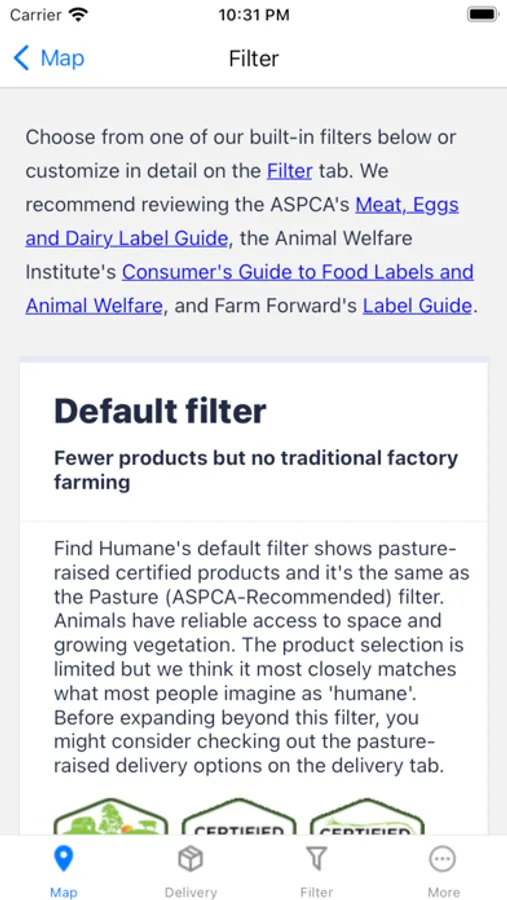 Features include filtering by humane certifications, animal types, humane practices, ingredients, and more. Different filters may be saved and quickly flipped between.