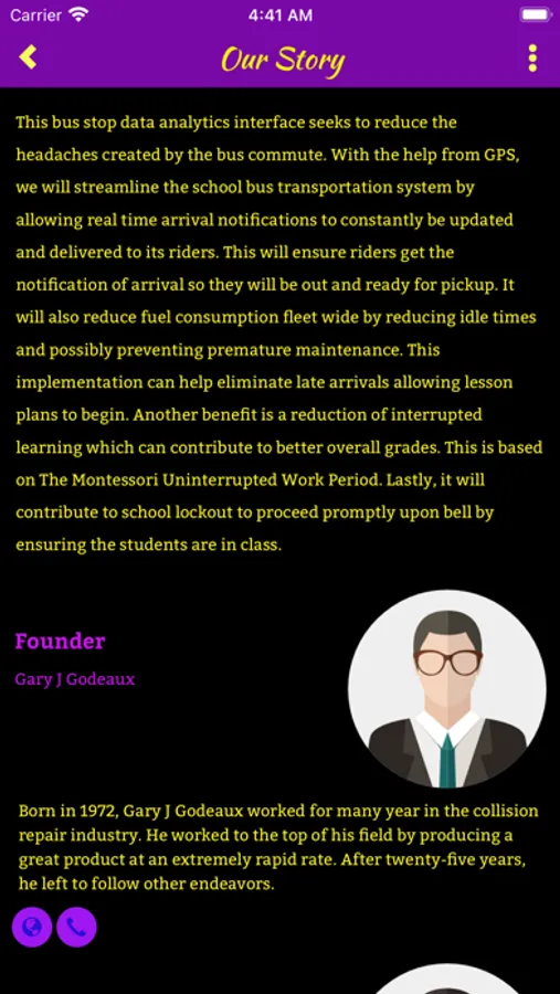 This is a school transportation analytics tool that uses real-time update on the buses arrival and sends it to the bus riders instantly. Pick-up times and drop-off times along with approximate location data.