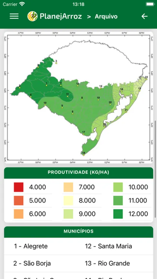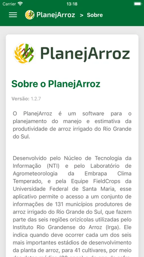 Esse aplicativo permite o acesso a um conjunto de informações de 131 municípios produtores de arroz irrigado do Rio Grande do Sul. Ele indica quando deve ocorrer cada um dos seis mais importantes EDP, para 41 cultivares, por meio das datas médias (30 anos) e do ano da safra, e os respectivos desvios entre elas. Essas informações são muito importantes para o planejamento e a tomada de decisão sobre o manejo da cultura. Além disso, o PlanejArroz também permite a estimativa da produtividade, na média dos anos e na safra, e o desvio entre essas duas variáveis, das três cultivares mais semeadas no estado.