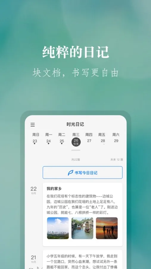 提供了快速书写日记的入口,简单纯粹,可以编写纯文本也支持图文。同时还支持天气和记录位置。