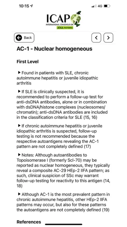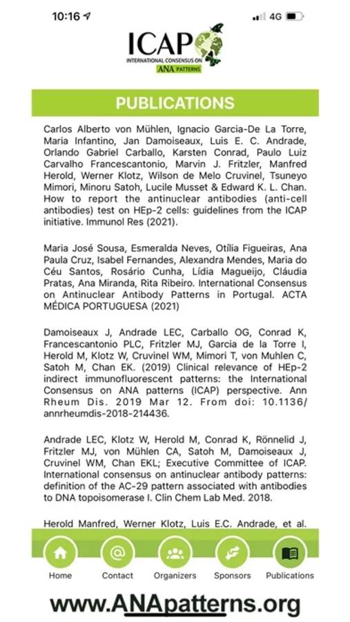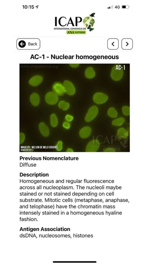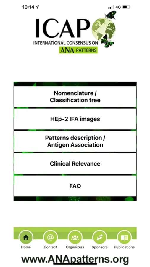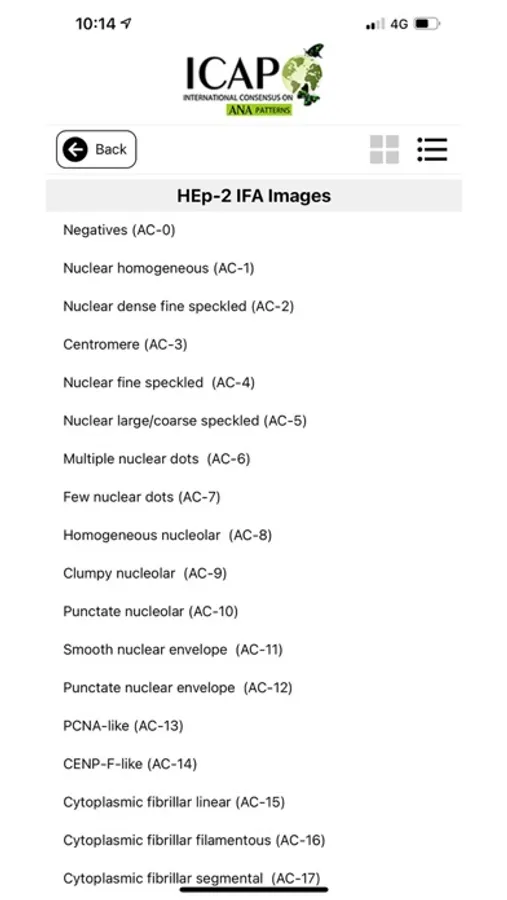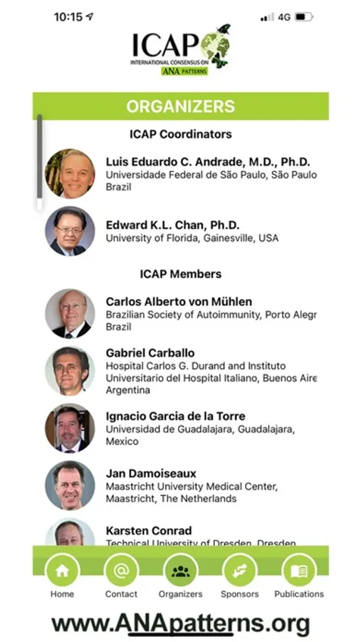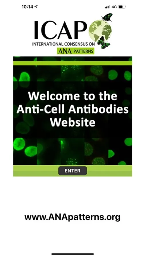 Welcome to the official app for the International Consensus on Antinuclear Antibody (ANA) Patterns (ICAP). ICAP was initiated as a workshop aiming to thoroughly discuss and to promote consensus regarding the richness and nuances of morphological patterns observed in the indirect immunofluorescence assay on HEp-2 cells (HEp-2 IFA). The ICAP initiative was implemented at the 12th International Workshop on Autoantibodies and Autoimmunity (IWAA, São Paulo, Brazil) by members of the Autoantibody Standardization Committee (ASC), a subcommittee of the International Union of Immunological Societies (IUIS) Quality Assessment and Standardization Committee and affiliated with the Centers for Diseases Control and Prevention (CDC). The ICAP committee is operating as an ASC sub-committee.