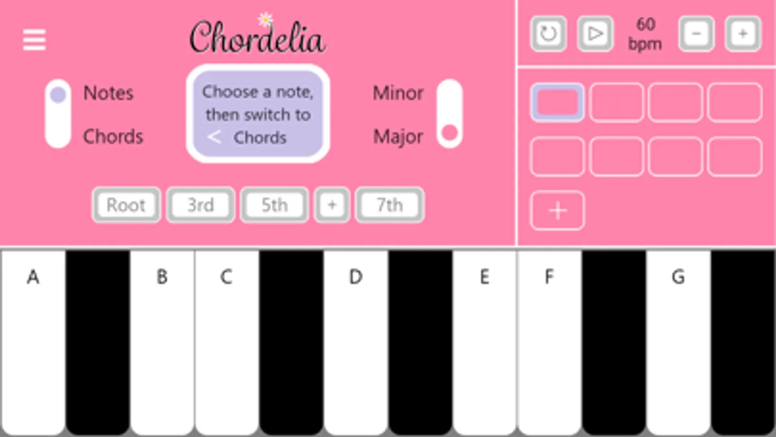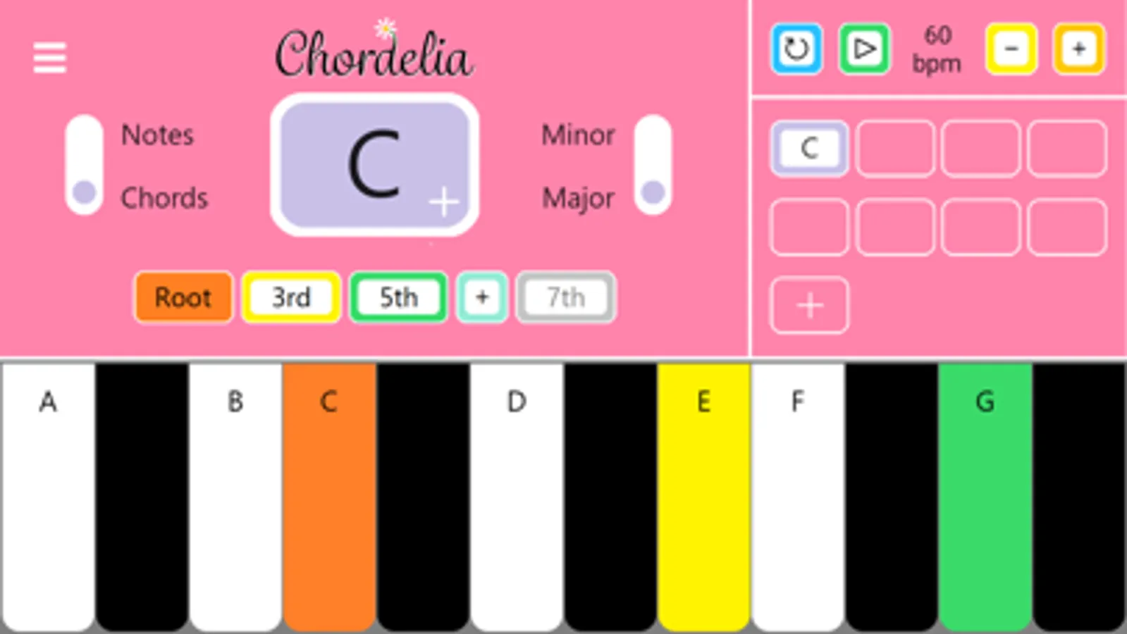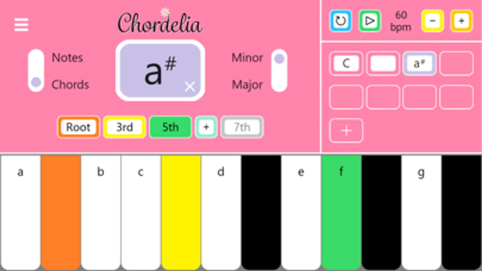 - All notes in the chord light up on the keyboard, in colours representing their position in the chord structure: