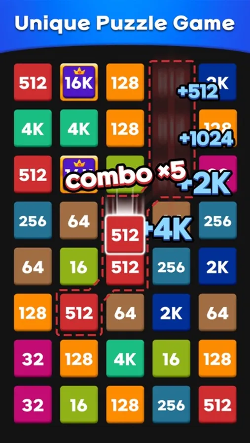 The objective of the is to drag and link the blocks with the same numbers into the higher numbers consecutively with the multiply of the first number of block that you choose. There will be more and more challenges as the numbers go higherm e.g. 1024 - 2048 - 4K - 8K - 16K - 32K and to infinity and beyond. I promise you, once you tried it you will not be able to stop playing this puzzle game.