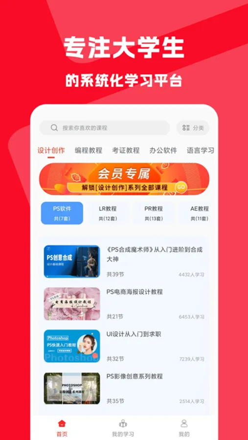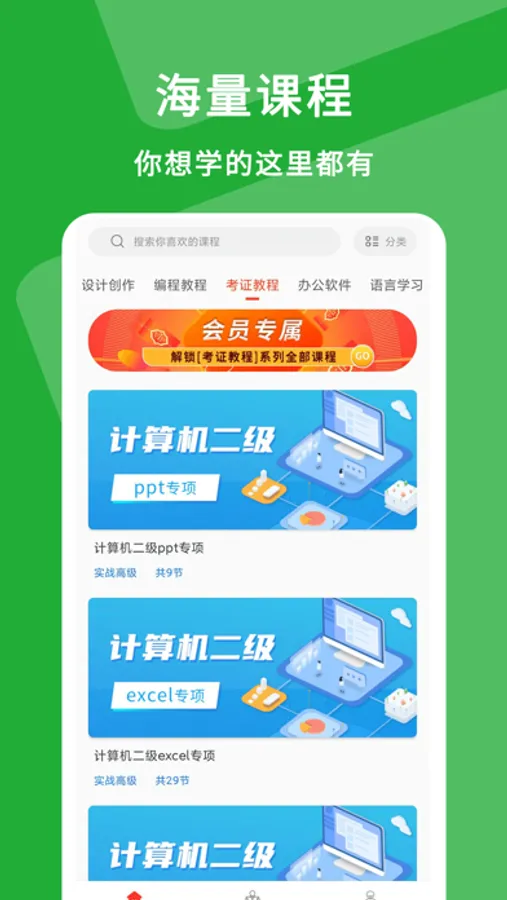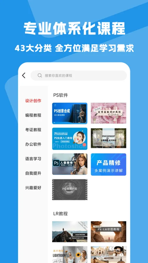 应用提供各行业的视频教学课程,有超10000+免费学习视频课程、完整规划好的学习路径,包含: