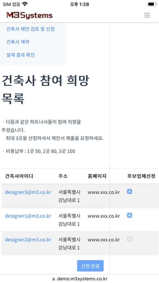 2. 시공사 선정 - 건축주는 입찰에 참여한 시공사에 대한 기업평가 내용과 포트폴리오를 참조합니다. M3는 견적을 분석해드리고 시공사 선정 및 계약진행을 도와 드립니다.