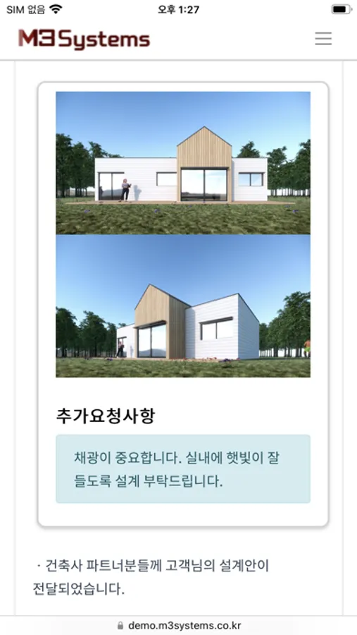 M3 자체 플랫폼 기반으로 국내 최초의 사용자 맞춤형 계획-설계-시공-유지관리 통합서비스를 제공합니다.