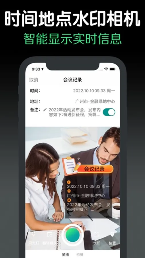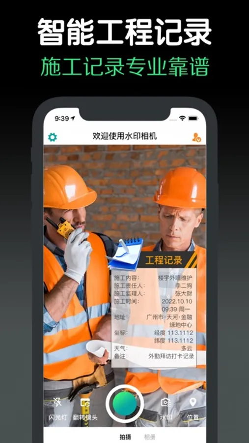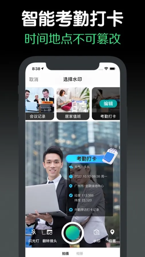这是一款智能好用的水印相机,记录生活日常、工作证明记录,为照片添加实时定位信息、天气信息、时间,添加的信息无法修改,具有防伪特性,我们提供7种好看的水印模板和1种可以灵活配置的自定义水印模板,提供了丰富的水印模板同时又可灵活自定义水印,实时定位地址可以选择附近一定范围内的地址减少定位误差导致地址显示错误,是一款不可多得的智能好用的水印相机。