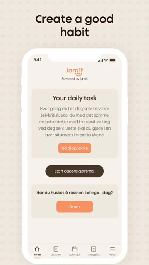 Noen mennesker kan ta et helt rom hvis de vil. De stråler, de er trygge og det er noe ved dem som man enkelt beundrer. Hva er det som skiller de fra mange andre? De som ikke lar seg påvirke av det rundt, de som virkelig står godt i seg selv? De er hovedrollen i sitt eget liv, og de skaper seg selv til den de vil være. Psyken vår må trenes på samme måte som vår fysiske kropp, det endres ikke over natten. Men med et riktig treningsopplegg kan du endre alt. Jamit har i samarbeid med noen av de beste fagfolkene på dette området satt mental helse i system, og lagd et strategisk treningsprogram der du step-by-step bygger opp deg selv til å bli den beste versjonen av deg. Den du innerst inne drømmer om å være.