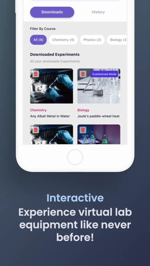 Over 186 interactive experiments in different fields of science, Chemistry, Physics and Biology. The science experiments are conducted in a virtual lab, designed to simulate real-life laboratory environments, complete with state-of-the-art equipment, tools, and instruments.