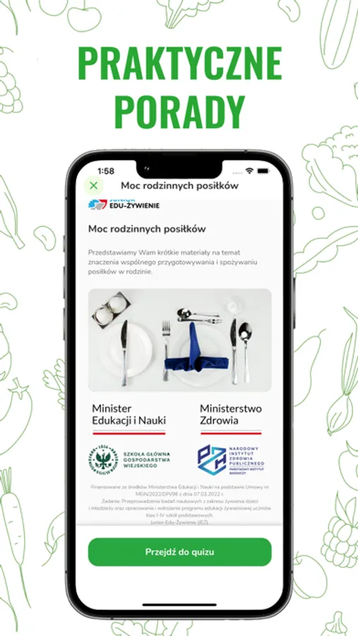 Nawyki żywieniowe, wyuczone w dzieciństwie, są kontynuowane w życiu dorosłym i dlatego istotne jest, aby już od najmłodszych lat prawidłowo je kształtować. W tym celu Ministerstwo Edukacji i Nauki zleciło SGGW przygotowanie programu edukacji żywieniowej uczniów szkół podstawowych Junior-Edu-Żywienie (JEŻ). Aplikacja została opracowana specjalnie do tego programu, aby wspomóc utrwalanie wiedzy na temat prawidłowego żywienia.