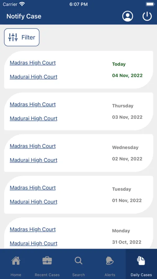 Daily case details of a particular court from the official website with filter options.