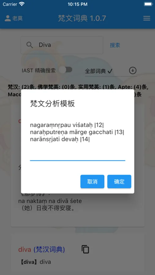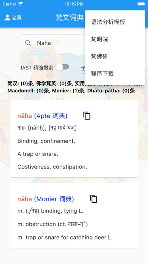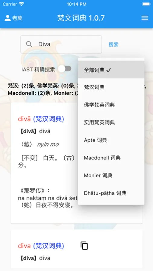1: 它内置六大梵英字典,本程序集成了 Apte,Macdonell ,Monier,梵汉词汇,佛学梵英词典(Buddhist Hybrid Sanskrit (1953) 词典)和实用梵英词典(Practical Sanskrit-English)等七个字典三十四万条单词,可以不用联网离线查询。
