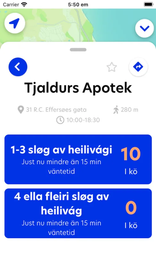 Click on a marker to see more information about that particular store like opening hours and estimated waiting time.