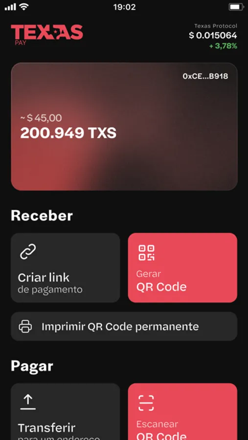 Com o TexasPay você pode receber e pagar por QR Code, consultar suas transações, aceitar o Texas Protocol em seu estabelecimento, acompanhar a cotação do Texas Protocol e muito mais.