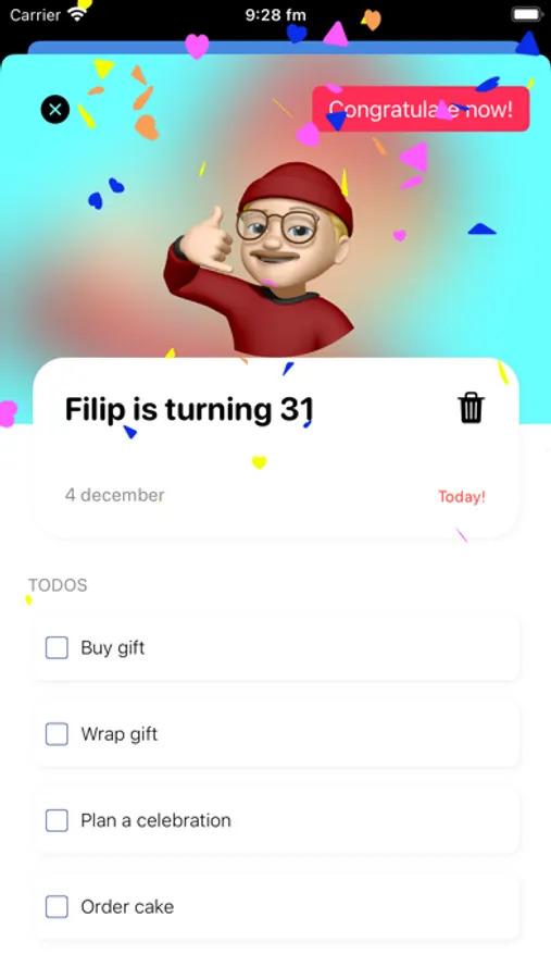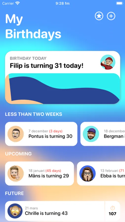 Add all your birthdays in the app and get notified on important dates!