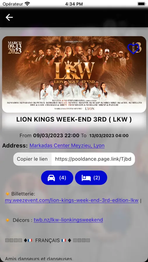 This application allows you to access the schedule of Kizomba events and to connect dancers in order to carpool: