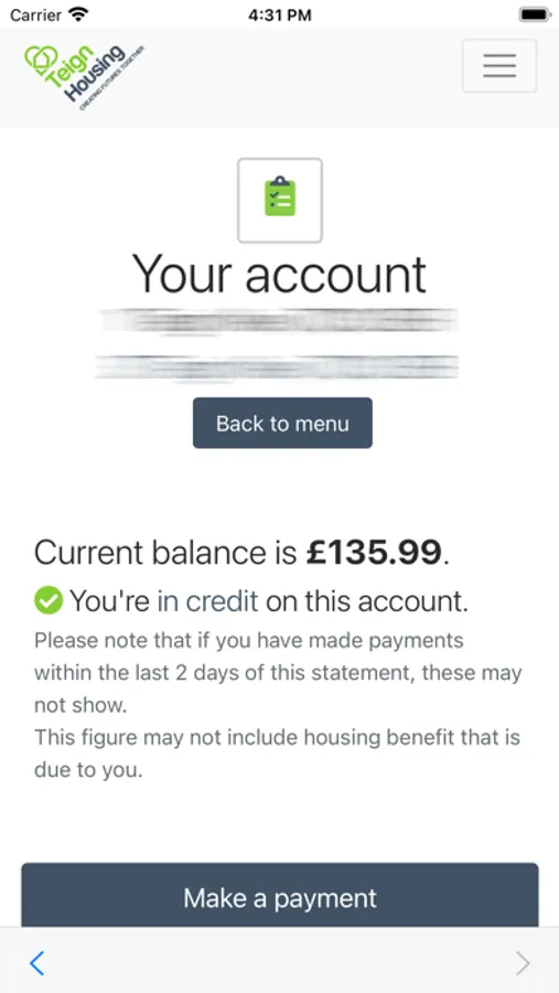 Our self-service portal app lets you manage your housing tenancy with Teign Housing. You can do things like request a repair or inspection, report anti-social behaviour, check your account statements and mini statement, pay your bill, and much much more.