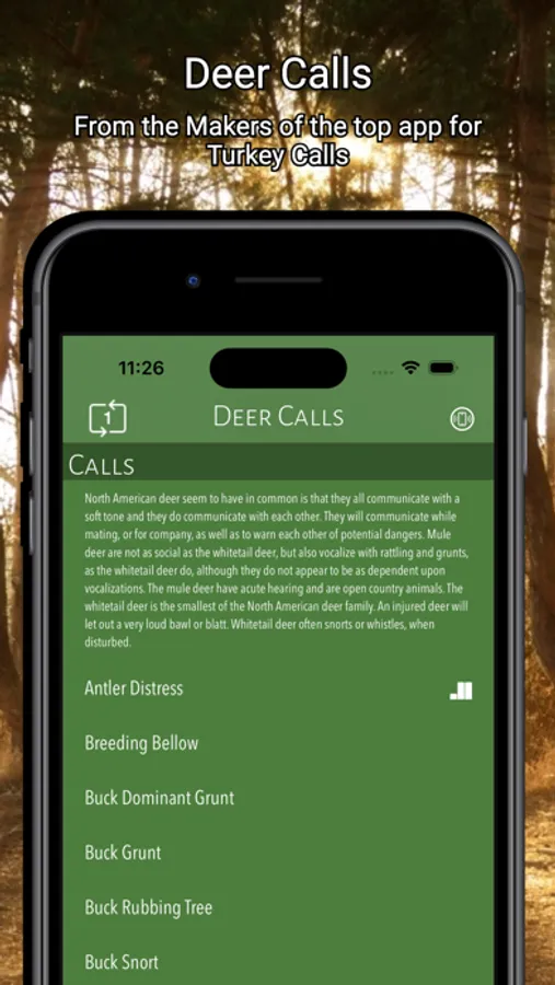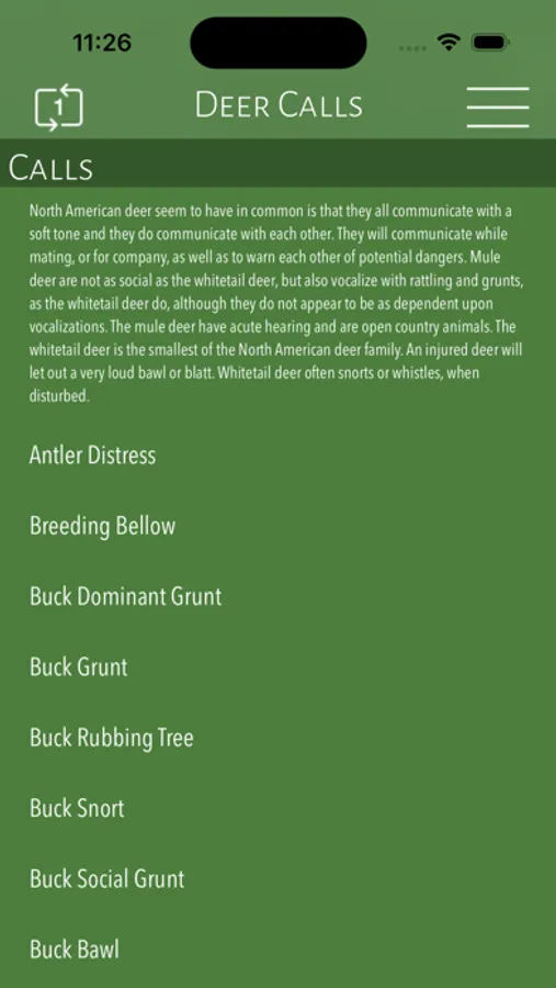 Deer Calls is a list of the most important calls necessary to help bring the big game to you! Practice against the real sound and perfect it for when you're behind the blind or up in the stand.