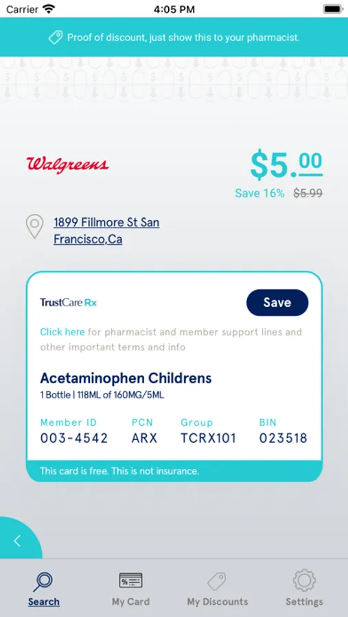 "The free TrustCare Rx app allows you to save up to 80% on brand and generic prescriptions at all major retail pharmacies including CVS, Wal-Mart, Walgreen, Rite Aid, Target, Kroger, Duane Reade and many more! TrustCare Rx helps you find the best possible deal based on your location because different pharmacies have different prices. Simply download the app, search for your medication and add the discount card to the """"My Discounts” section. To receive your discount, present your card to the pharmacist at the time of purchase.