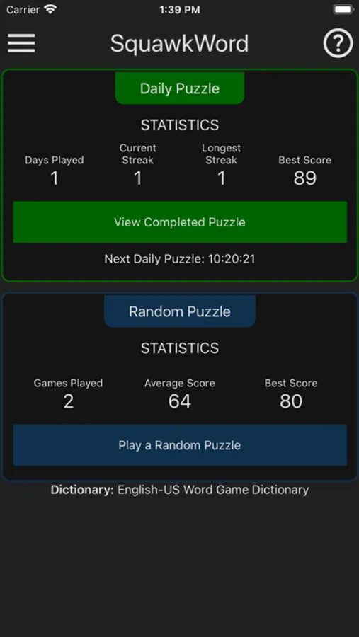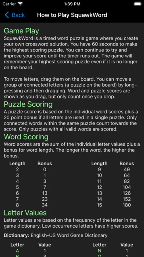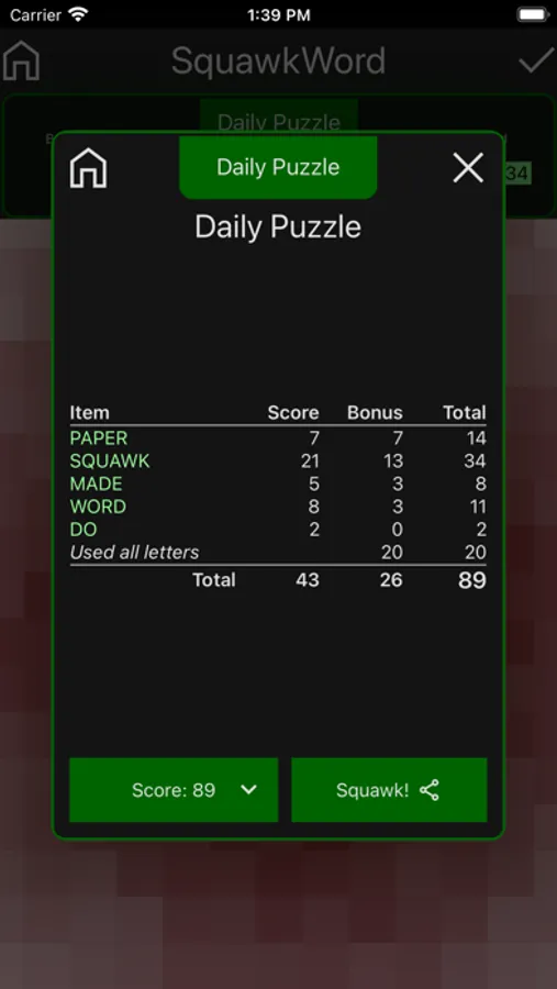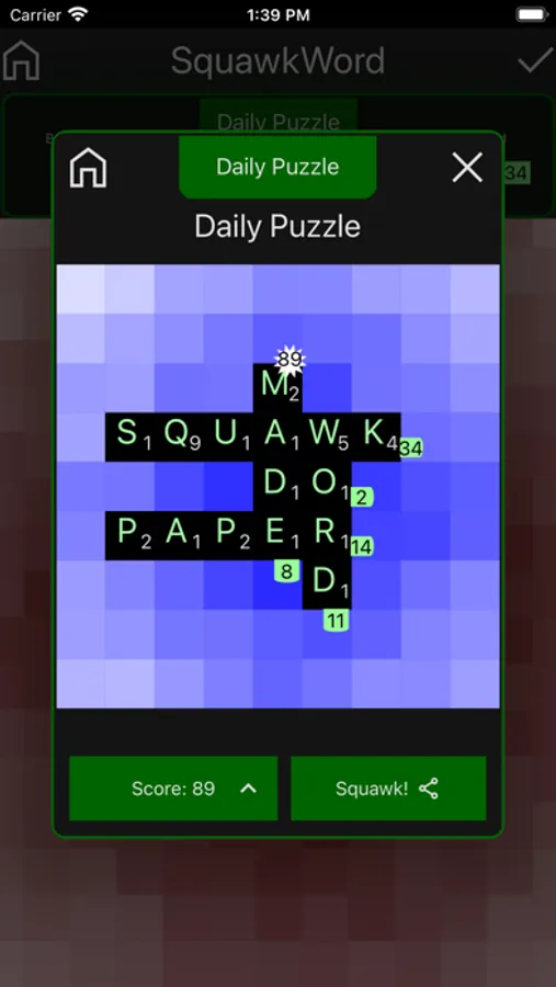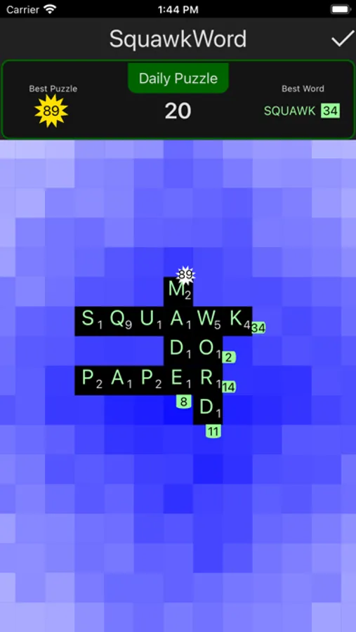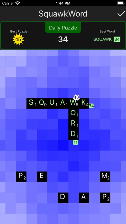 SquawkWord is a timed word puzzle game where you create your own crossword solution. You have 60 seconds to make the highest scoring puzzle.