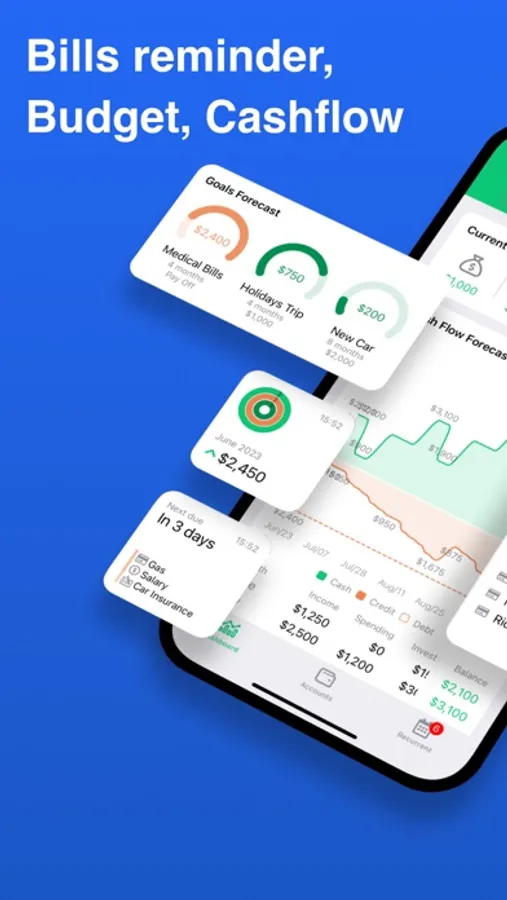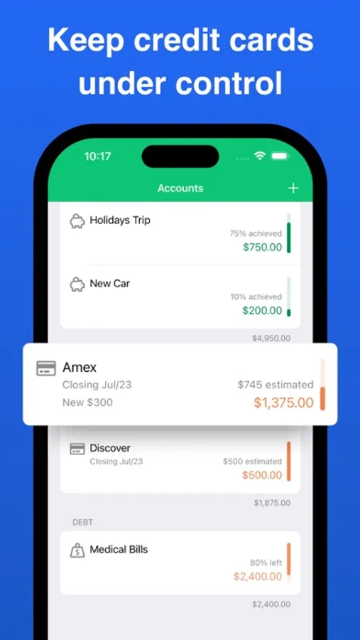 • Accounts - Keep track of accounts' balances, set savings goals and original debt, credit cards usual spending and statements closing date, and more.