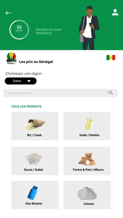 L’application Njëgg yi est plateforme qui donne les prix homologués des denrées de premières nécessite au Senegal. Cette application permet au citoyens sénégalais d'avoir directement l'information sur les hausses et baisses des prix des denrées de premières nécessite et de dénoncer les fraudes.