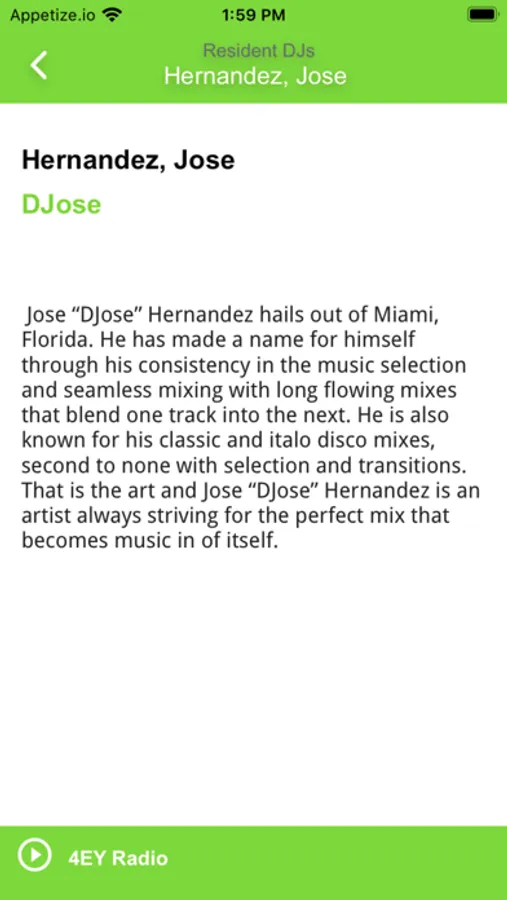 An online music streaming platform with music curated by some of the best DJ's with years of experience hooked into yesterdays music but also todays vibe. 4EY Radio delivers all music using it's house music based approach so that even yesterday's hits have been infused with todays vibe. Mixes are scheduled throughout the day by the resident DJ's for those that love that seamless transition from one song to another.