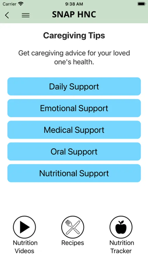 The SNAP (Survivorship Needs Assessment Planning) App provides tailored resources, education and support for head and neck cancer survivors and their caregivers as they transition from active care to survivorship care. The app provides symptom management tips, supports emotional and physical well-being, features peer and provider videos, goal making, nutritional tracking, recipes, and more, with the goal of easing the transition to a new normal.