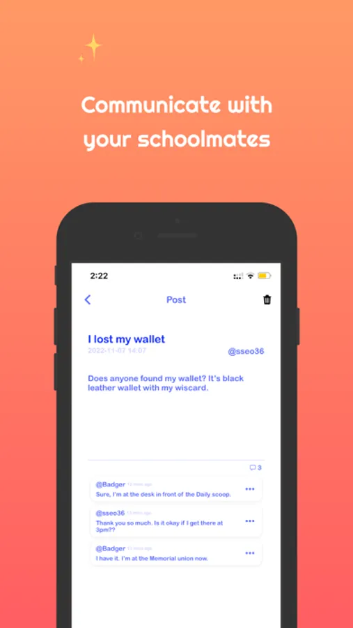 Share information with your schoolmates through the bulletin board. Share and acquire information on boards such as Lost & Found, Buy & Sell, and Sublet & Roommate.