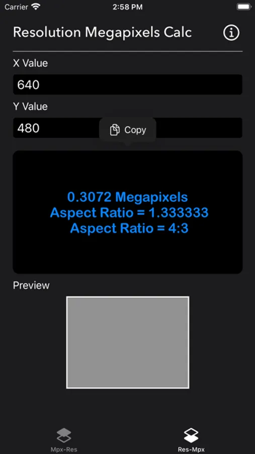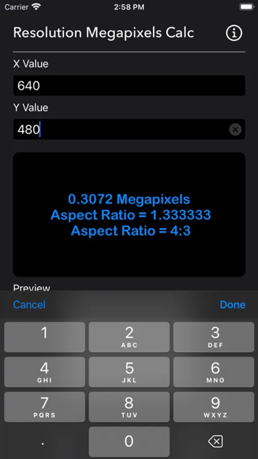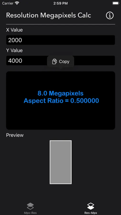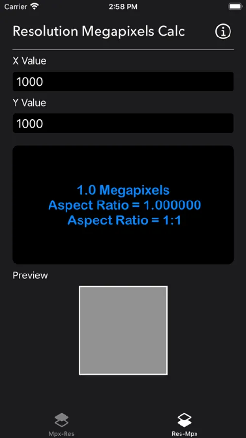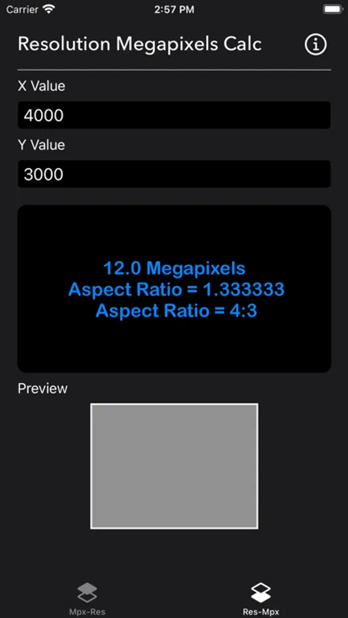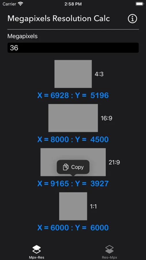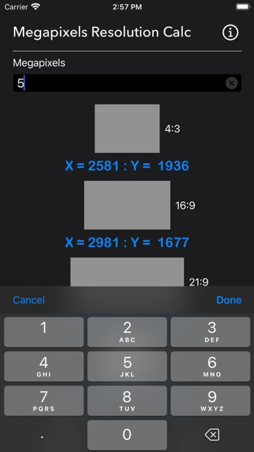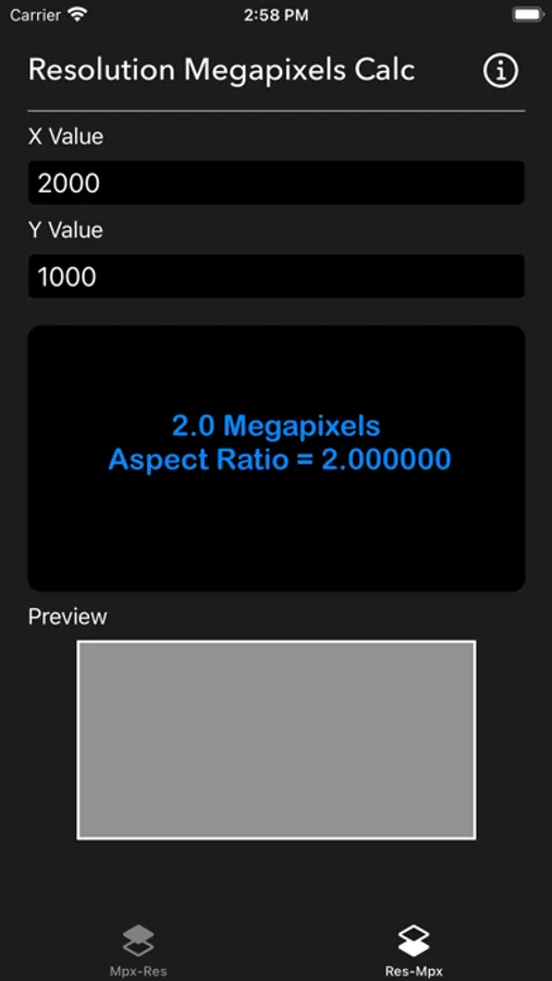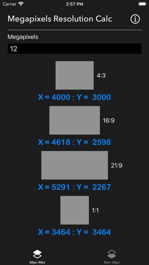 This is a megapixel-resolution calculator, a tool to calculate and convert the graphical resolution base on 4 different aspect ratios 4:3 (SD), 16:9 (HD/fHD/4K), 21:9 (cinema) and 1:1.