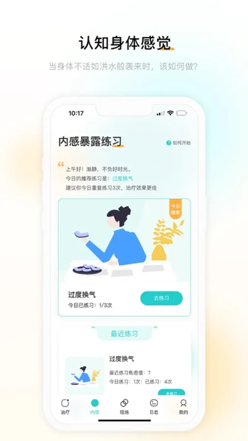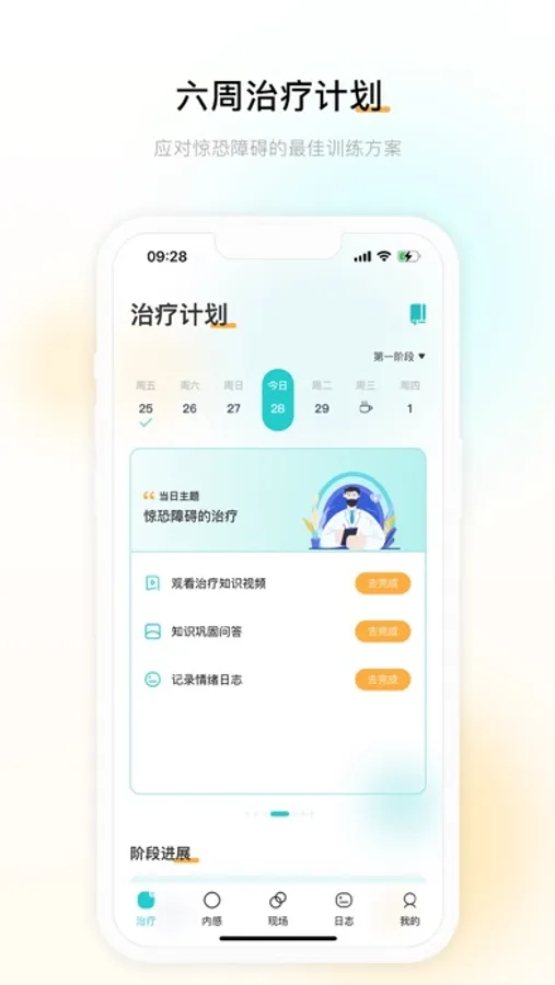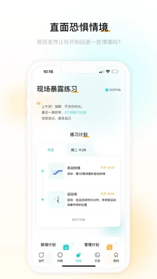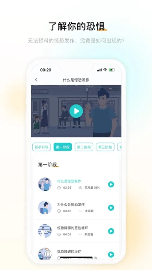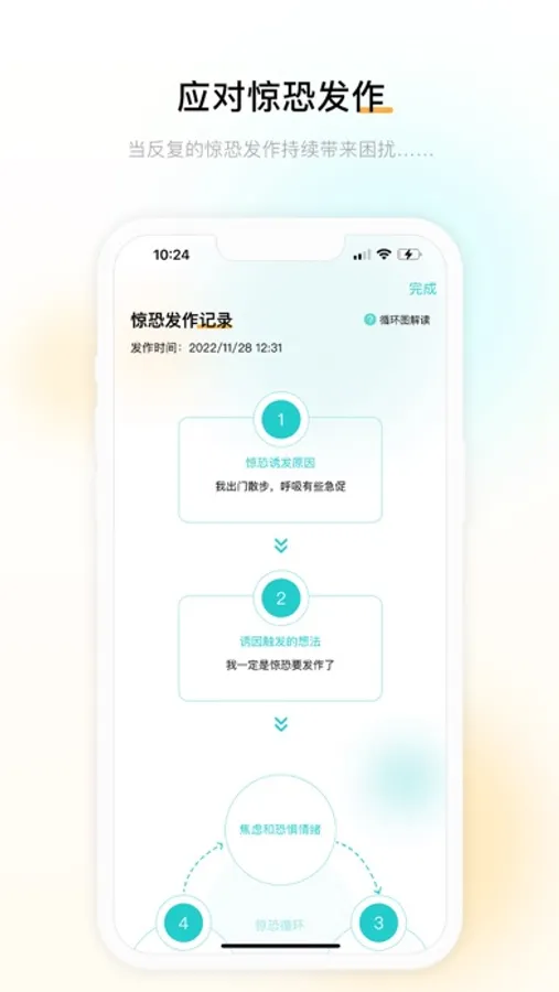 「渐静」采用认知行为疗法,基于你的惊恐情况,为你定制为期6周的个性化干预方案。通过深入浅出的治疗知识学习,了解惊恐发作的底层原理。通过针对性的行为训练,熟悉并克服惊恐发作的不适感,让你找回对身体的掌控感。学会科学地面对你所回避的情境或场所,从此不畏恐惧,轻松前行。