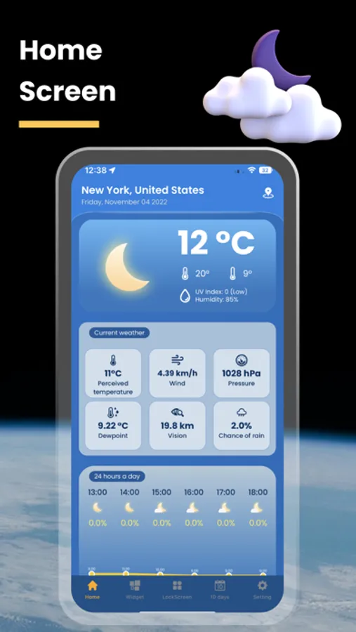 - 12-hour weather preview (temperature, precipitation), comfort index (dew point, humidity, wind chill, how it feels), UV index and wind forecast