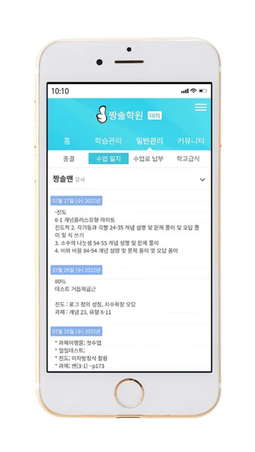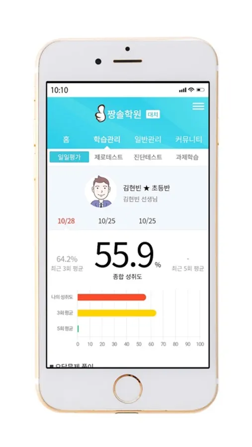 학원에서 진행되는 일일평가 테스트 결과를 앱을 통해 실시간 확인할 수 있으며, 오답노트를 제공받거나, 오답에 대한 유사문항을 제시받아 오답에 대한 대비를 철저하게 수행할 수 있습니다.