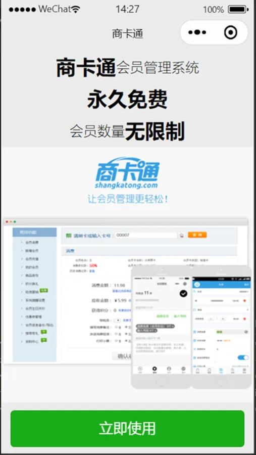 商卡通致力于为客户提供免费,安全,专业的会员管理系统,功能合理,页面简洁,并围绕会员管理产品,结合互联网和移动互联网新媒体,为商户提供更多有效,便捷的创新营销方式,打造真正符合用户需求的移动会员通。