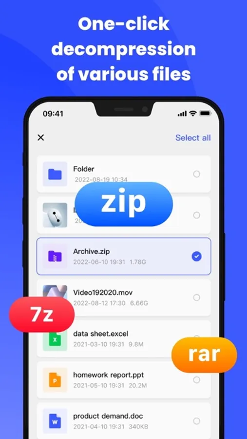 Unzip Pro is a powerful file management tool for mobile. Focusing on fast decompression and compression of files, it supports rar, zip, 7z and other formats; at the same time, it has both file transfer and data migration functions, supporting mutual transfer from mobile to mobile and from mobile to computer, with no traffic throughout!