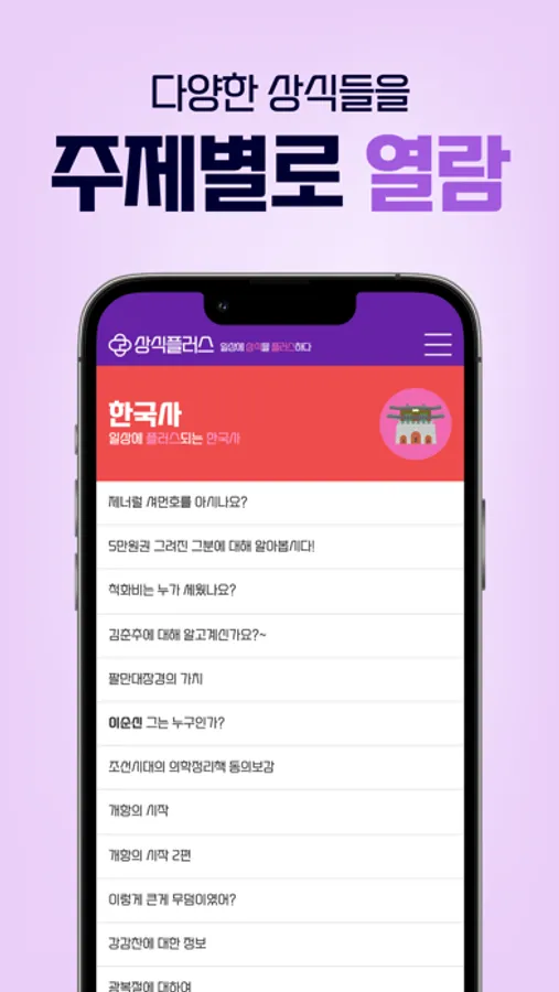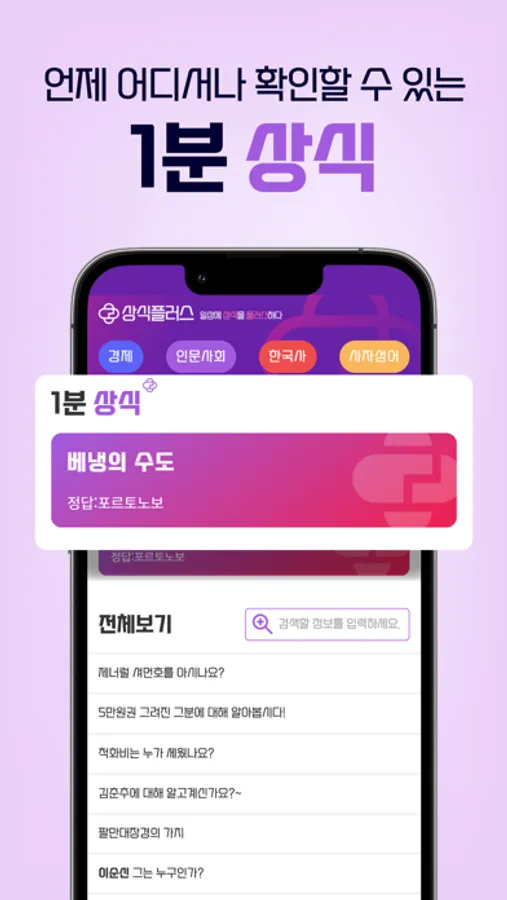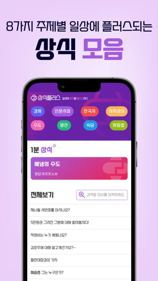 경제, 인문사회, 한국사, 사자성어, 명언, 속담, 맞춤법 등 다양한 분야의 상식을 카테고리별로 구분하여 원하는 분야의 상식을 플러스 할 수 있어요!