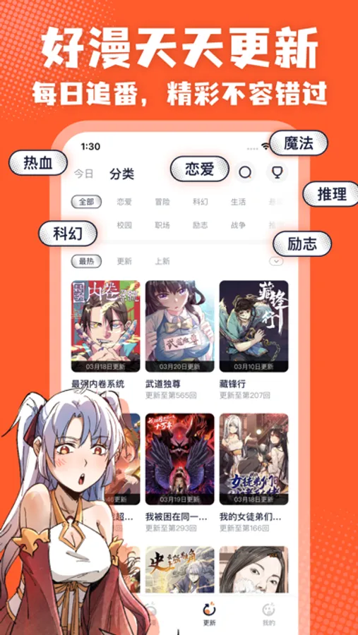 热血漫画、冒险漫画、搞笑漫画、恋爱漫画、言情漫画、玄幻漫画、动作漫画、悬疑漫画,恐怖漫画、耽美漫画,百合漫画、科幻漫画,治愈漫画,校园漫画、豪门漫画、霸总漫画、古风漫画、战争漫画、竞技漫画……你喜欢的这里都有哦~每日追番,精彩不容错过!