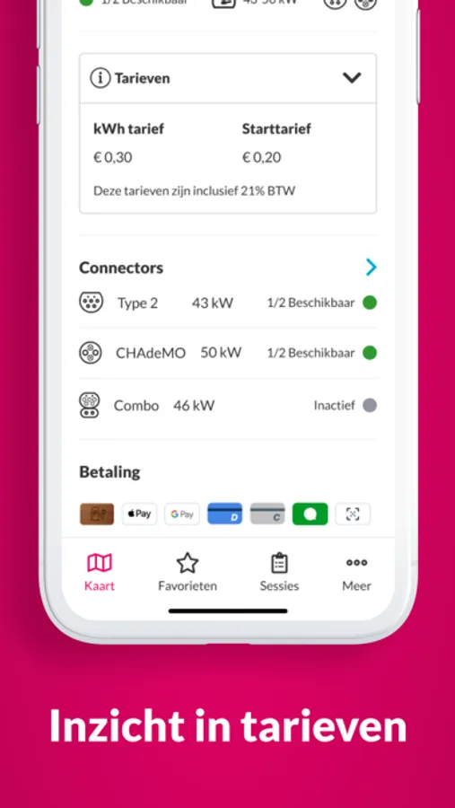 - Zie in 1 oogopslag welke laadpalen beschikbaar zijn en tegen welke tarieven.