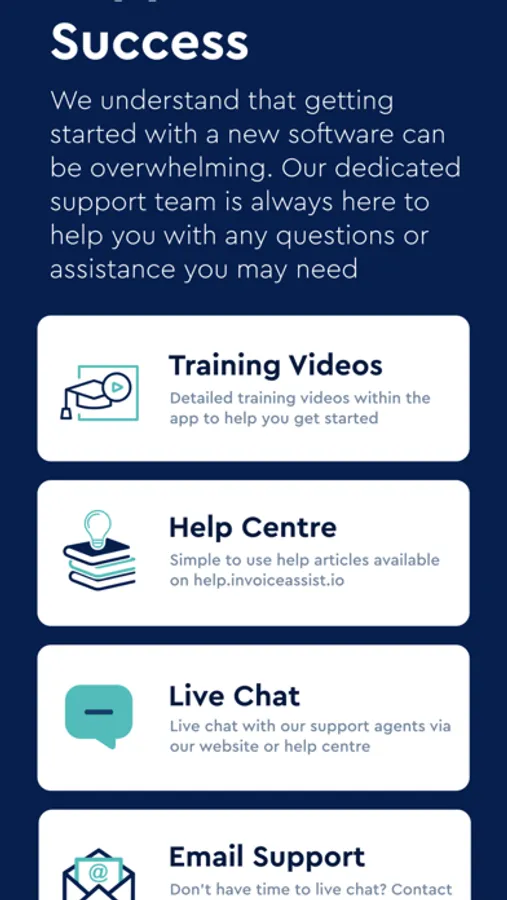 At Invoice Assist, we take pride in our exceptional customer support through our dedicated agents, comprehensive Help Centre and training video. We're always here to help you with any issues you may encounter.