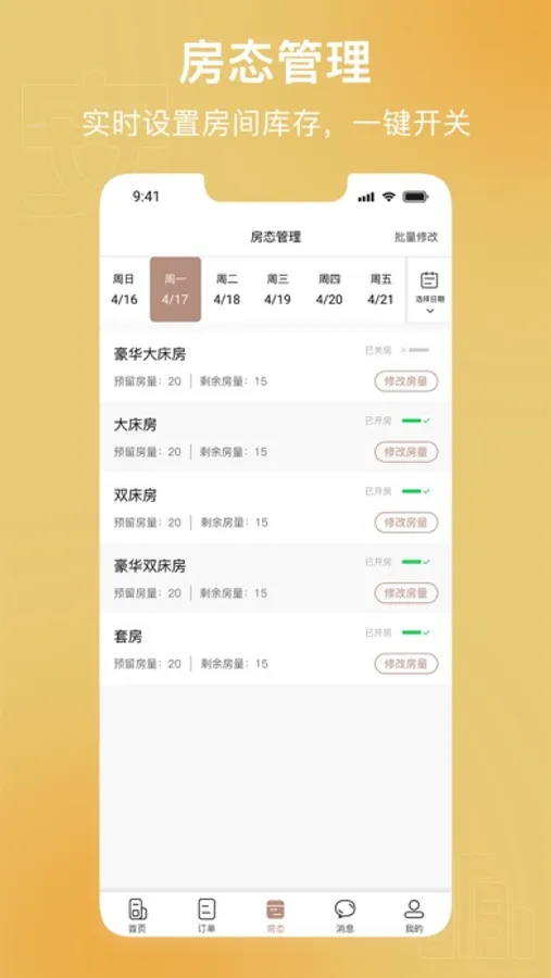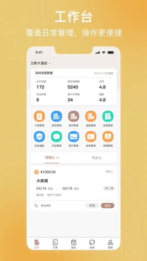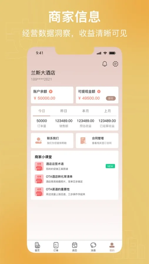 安住会商家版APP是专门为安住会合作的酒店商家打造的酒店管理APP,它可以让商家时时刻刻了解酒店的运营状况。商家也可以在APP中一键查看和修改酒店信息、价格信息、房态信息、回复评论等,从此让商家摆脱电脑的束缚。