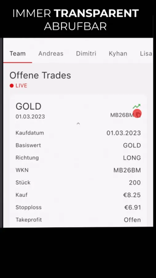 Schaue unseren Händlern börsentäglich zwischen 8:30 - 17:30 Uhr dabei zu, wie sie Monat für Monat die bestmögliche Performance an den Märkten erzielen. Dabei verpasst Du mit der App keine lukrative Chance mehr, lernst viel und bekommst gleichzeitig den besten Eindruck vermittelt, wie täglicher, aktiver Börsenhandel wirklich funktioniert.