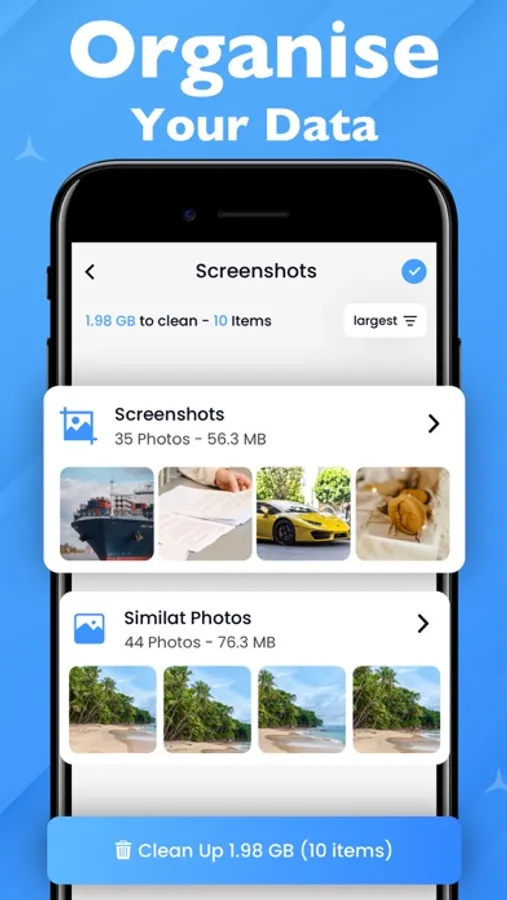 Cleanup helps you by cleaning similar and duplicate photos, large-size videos, screenshots, etc., and improving the performance of your device. The safest method to clean your phone is what we're bringing you right now! TRY IT OUT NOW!!