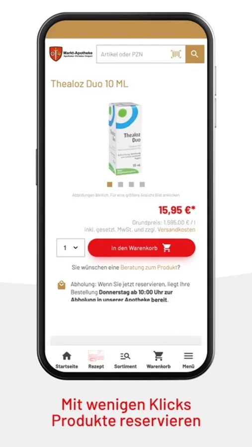 Wir bieten Ihnen über die App unser gesamtes Sortiment. Nicht sofort verfügbare Produkte bestellen wir für Sie und machen Sie in der Regel bis zum nächsten Werktag abholbereit. Gerne liefern wir Ihnen Ihre Bestellung per Botendienst direkt nach Hause.