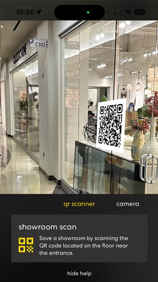 The app’s Scan2Save feature uses the app's camera scanner to instantly pull up a Showroom Seller’s profile & contact details from a QR code at the Showroom door.
