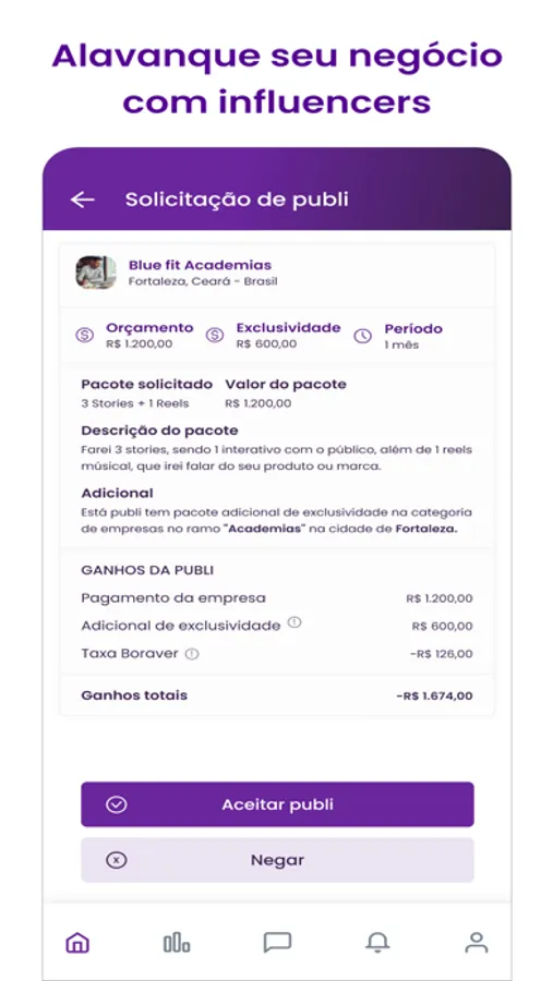 Observando essa necessidade do mercado, a Bora Ver Influencer conseguiu desenvolver uma plataforma web de fácil utilização por pessoas físicas e jurídicas para o fechamento de negócios. O software conta com um aplicativo voltado aos influenciadores para receber demandas dos clientes e negociações, envio dos arquivos criados para a provação dos contratantes, assim como uma forma de receber os valores negociados de forma rápida e fácil.