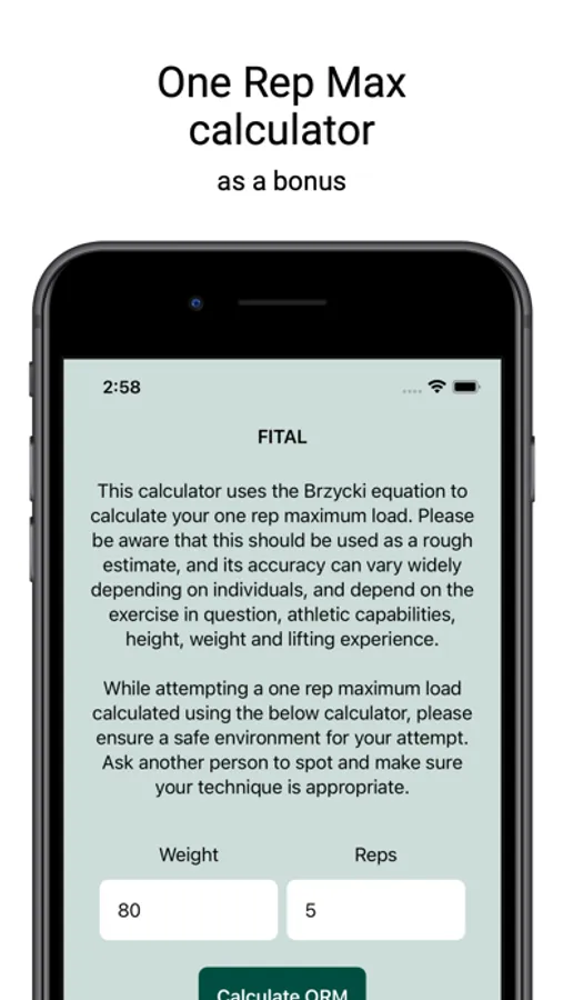 Ever thought about replacing that notebook you carry around with you at the gym with something more modern? If so, FITAL is the tool for you. It allows you to track repetitions, sets, weight and rest between sets in a simple and intuitive way, for free. It also includes a handy One Rep Max (ORM) calculator, allowing you to estimate your maximum one repetition load for an exercise, based on weight and reps entered.