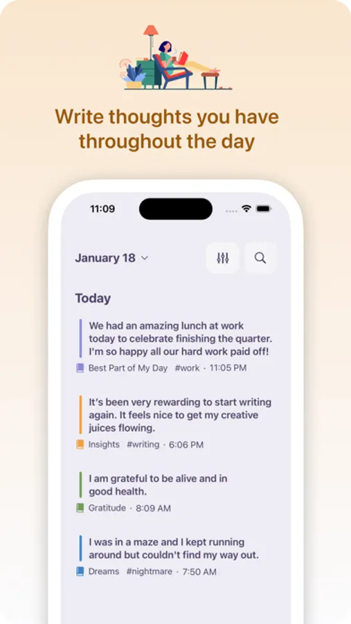Scribble is perfect for people who wish to record their thoughts, but don’t have the time to sit down and write a long journal entry. Use Scribble whenever you have a thought that’s worth remembering and categorize it into a relevant journal/tag to easily find it later.