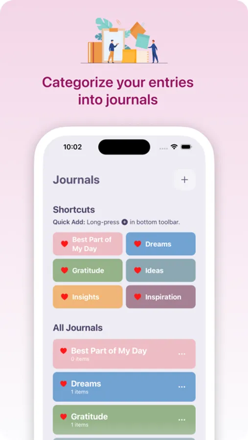 You can assign each entry to a specific journal/topic. This will color code your entries to the journal’s corresponding color and make your entries easier to organize. (i.e. Ideas, Goals, Insights, Dreams)