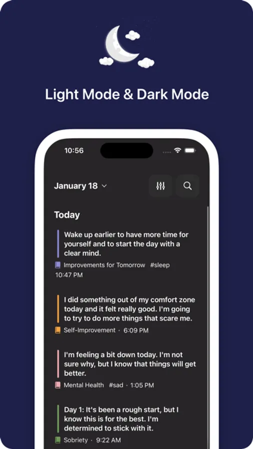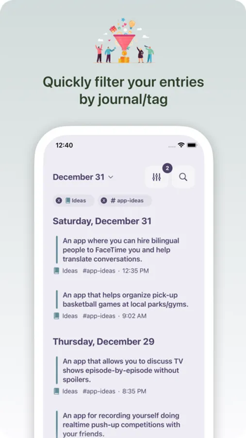 You can quickly filter your entries by any combination of journals, tags, and more. Tap on any label to add that filter, and only see entries matching those filters