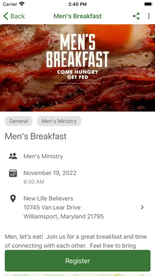 Events: Stay up to date with all our church events. View information and register for events from within the app.